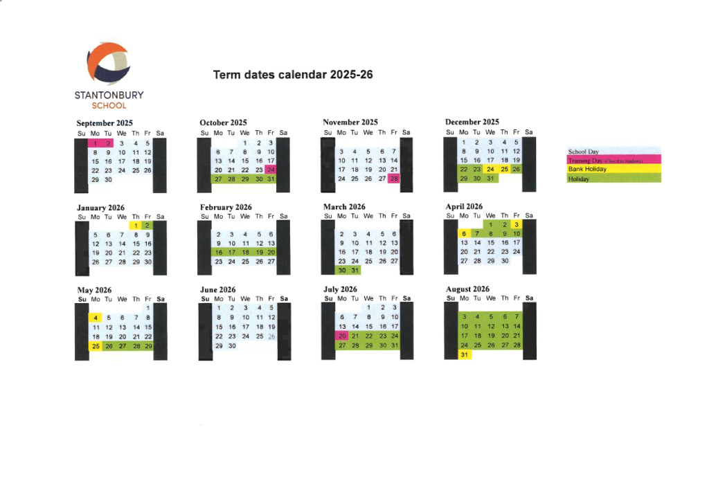 Whole school begin Term 1 on Wednesday September 3rd 2025 Teacher Training Days: the school will be closed to students: Friday 24th October 2025 and Friday 28th November 2025, Monday 20th July 2026. Bank Holidays: the school will be closed to staff and students: August 25th 2025, 25th & 26th December 2025,4th & 25th May 2026. |